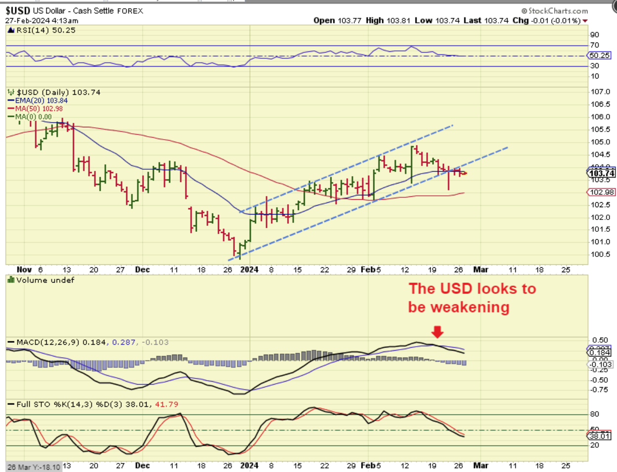 THE USD WEEKLY hit that $105 area that I have been discussing & pointing toward for many weeks as a resistance area and as a target area for (hopefully) a pullback.  So far it pulled back and now we just need to wait and see if this is the time for the USD to begin to drop down into that 3 yr cycle low or not.  It is also not uncommon to get a false breakout, and we could get a break higher in the next daily cycle and then it fades as we get closer to possible rate cuts or rate cut discussions by the Fed.