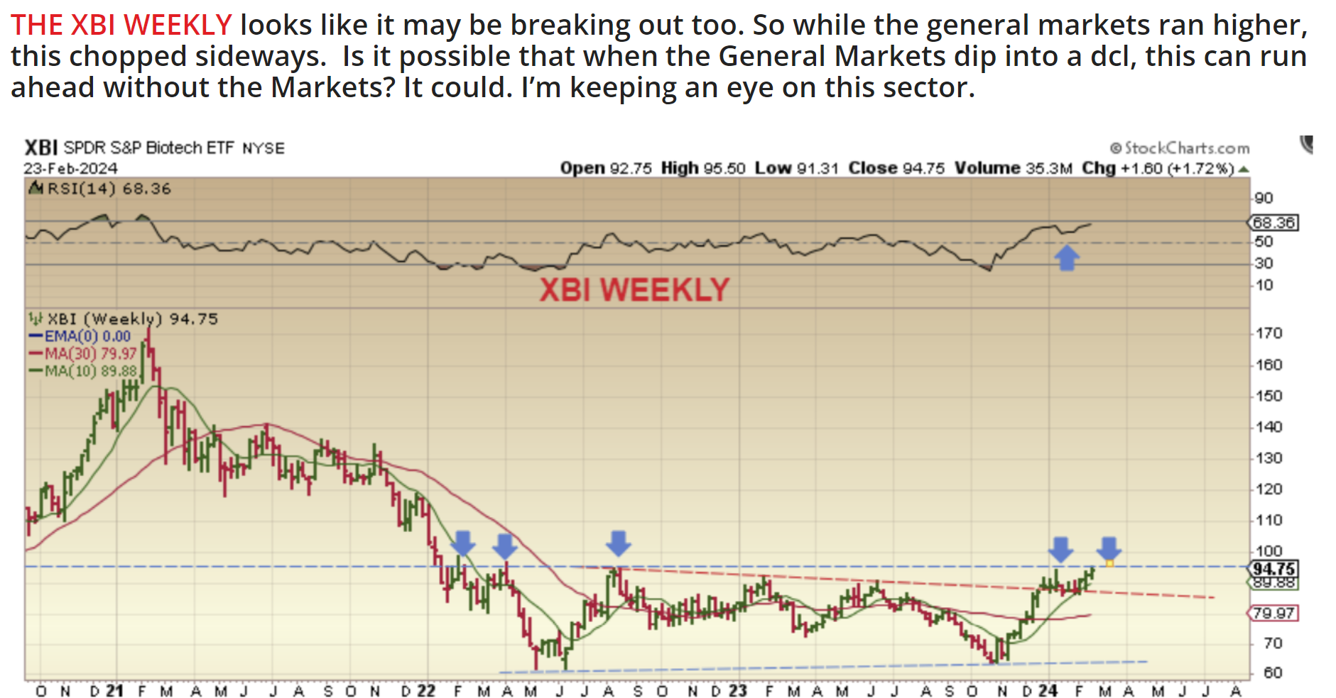 In the weekend report, I mentioned that the set up with Biotech looks bullish, and it is possible that this sector will run while the markets dip.
