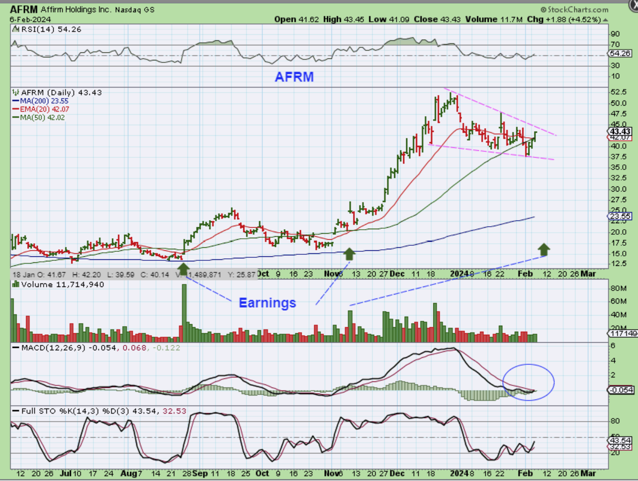 AFRM was in a report recently and it is also trying to recover that 50sma. It did so yesterday. It does have ‘earnings’ this week, but the last 2 earnings reports were good and saw price run higher. AFRM ran from $20 to $52 recently.