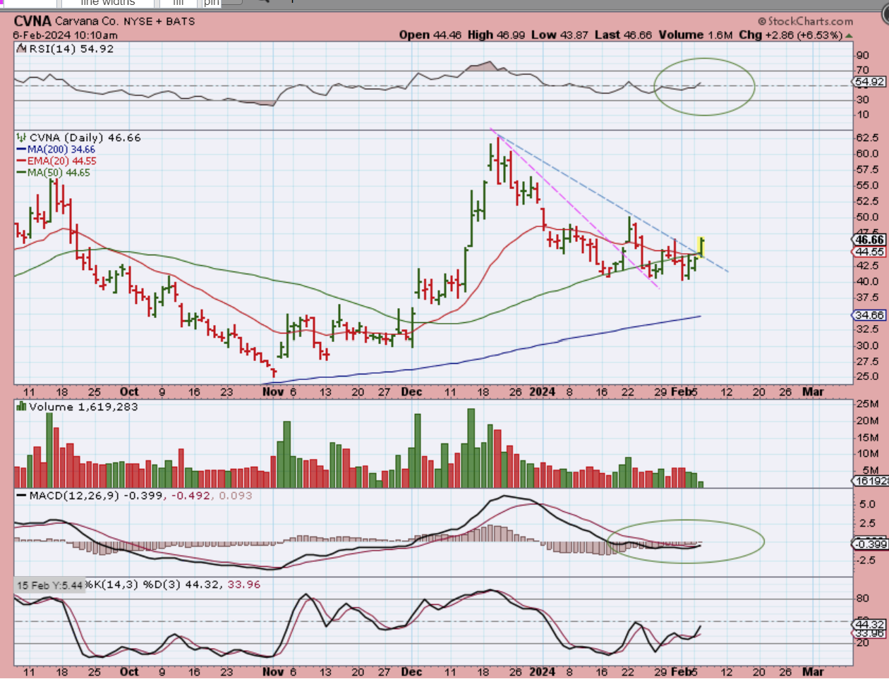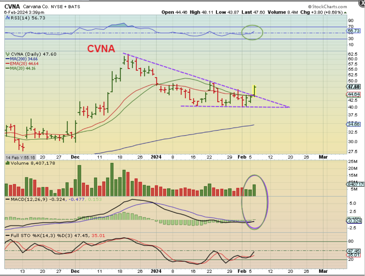 CVNA was a buy right at the open, as it started to break out, and I posted CVNA one half hr into trading, showing that it broke out above the downtrend & 50sma.