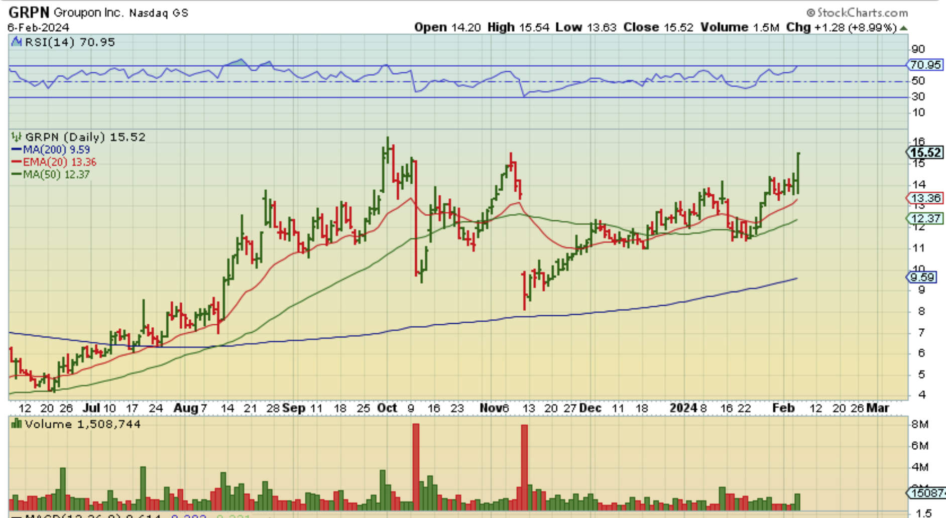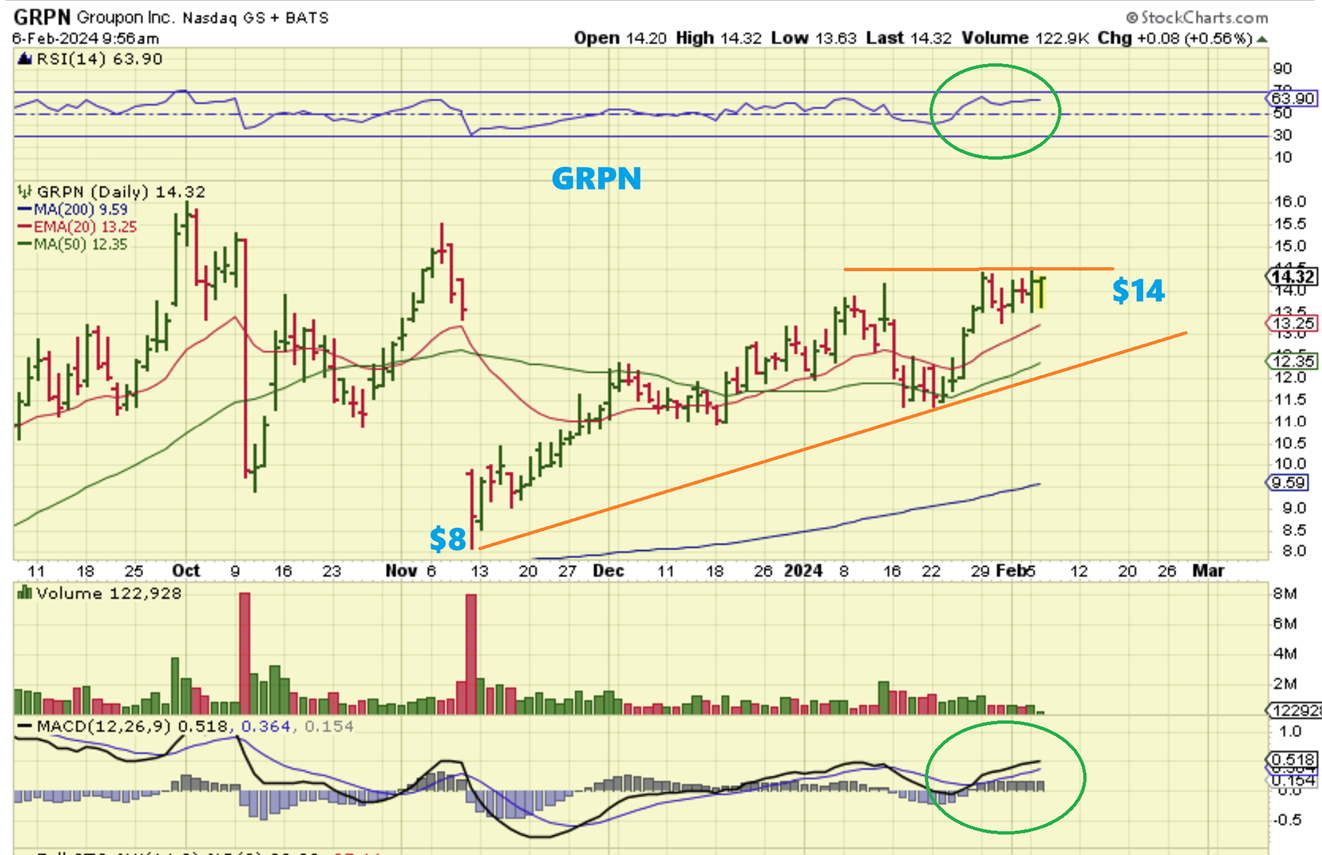 GRPN continued higher to $15.52 and was up about 9%, breaking to new highs. It can continue higher, but if it dips lower, the next reversal will be a buy too.