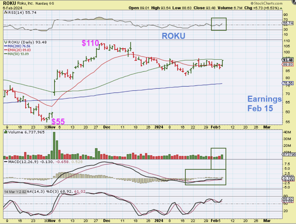 The set up on ROKU looks bullish as it pushes on the 50sma. You could wait and buy it if it breaks above that 50sma. It does have earnings coming up, so keep that in mind if you enter this trade.(Note: this may actually just continue to chop under the 50sma until earnings are released).