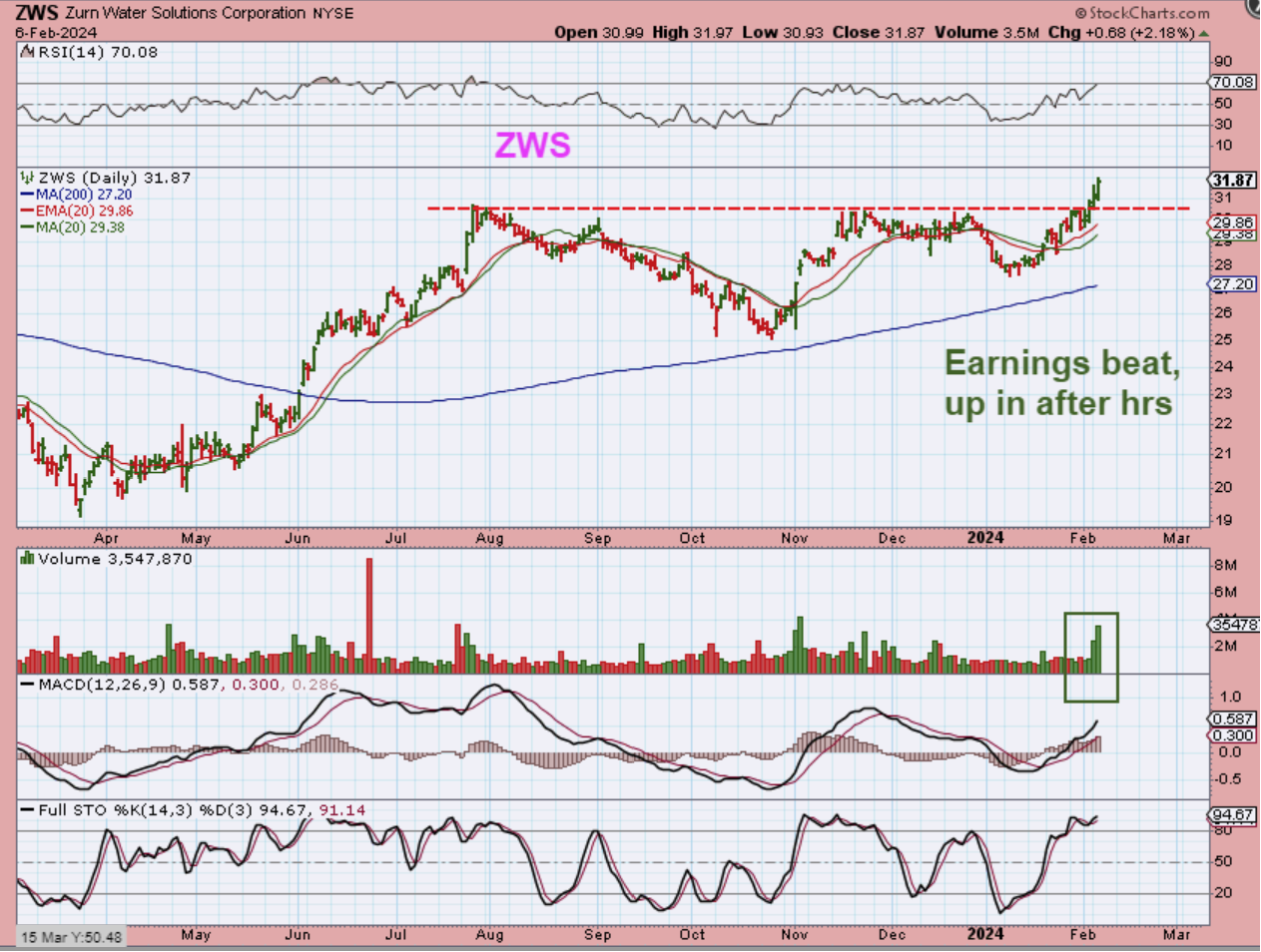 ZWS moved 2% higher, BUT it also released an earnings beat and gained another 3%. It gradually sold back down to $32, so it may open without a gap, and hopefully continues higher.