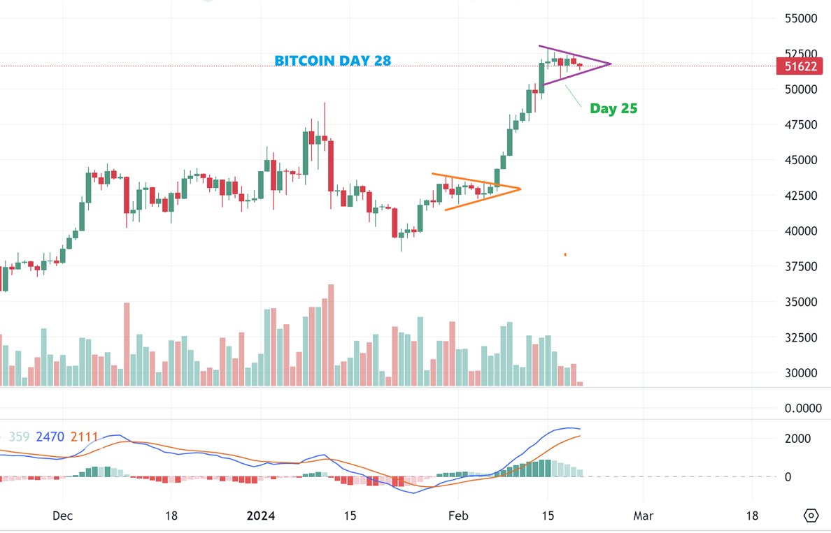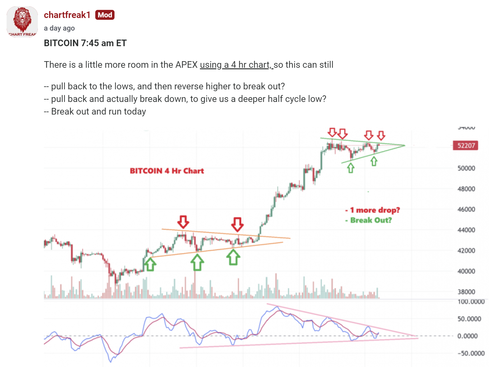 BITCOIN – Yesterday pre-market I started to see a possible triangle form, but with the timing of that 1/2 cycle dip still in play, I mentioned that this could break out and run higher, or break down, so…