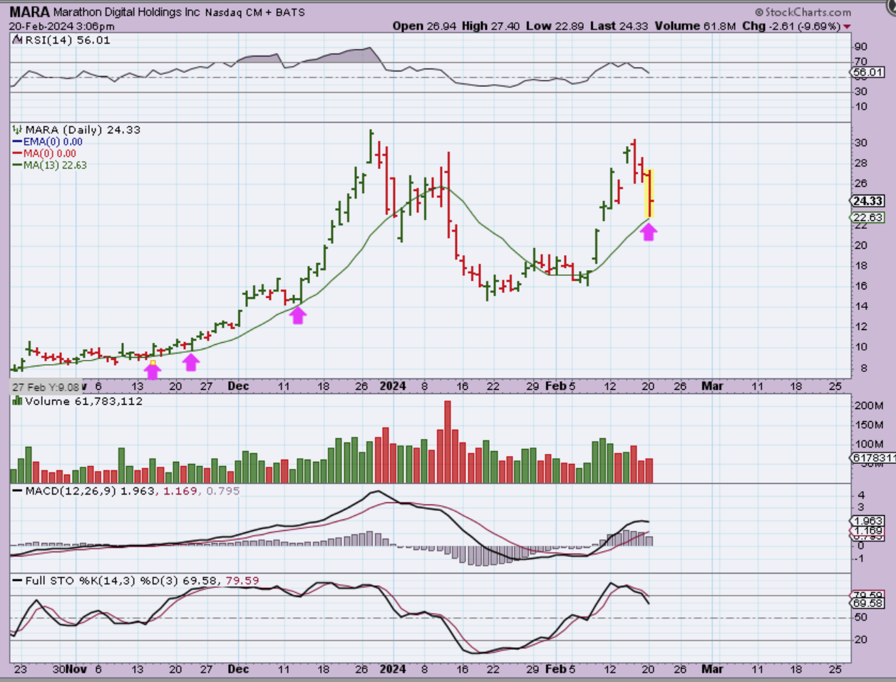MARA bounced at the 13 sma and came up short. This was 3 pm and it was now only down 9.5%, and it closed down 9%. THIS CAN DROP FURTHER.