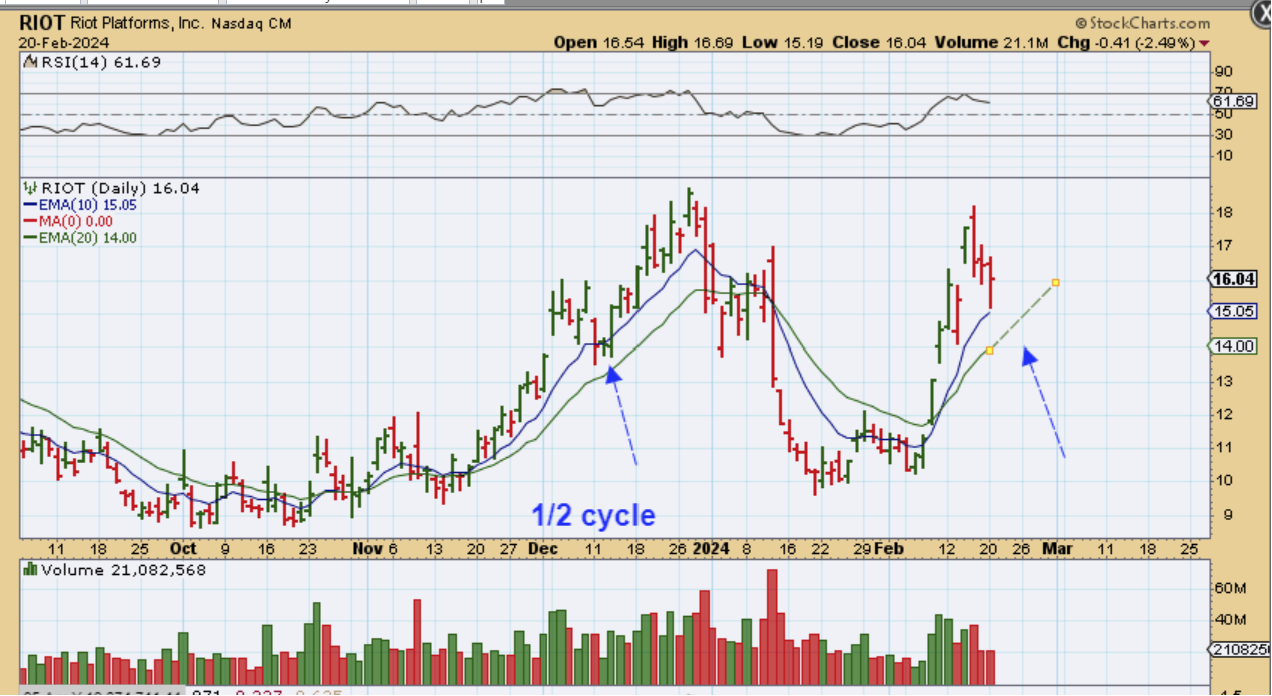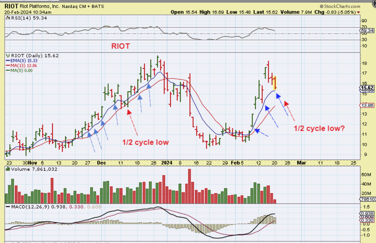 RIOT dropped 5% by the first hour of trading, so I drew this up with possible support areas. In the last run, it tagged the blue 8 ema on the way higher, but that 1/2 cycle low tagged the red 13 sma.