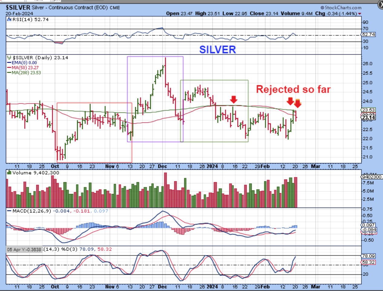 I have mentioned that SILVER did something odd- it took out the recent highs at the end of January making this look bullish. It was rejected Friday and Tuesday at the 200sma again though. The MACD looks bullish, so we’ll see what happens at the end of the day.