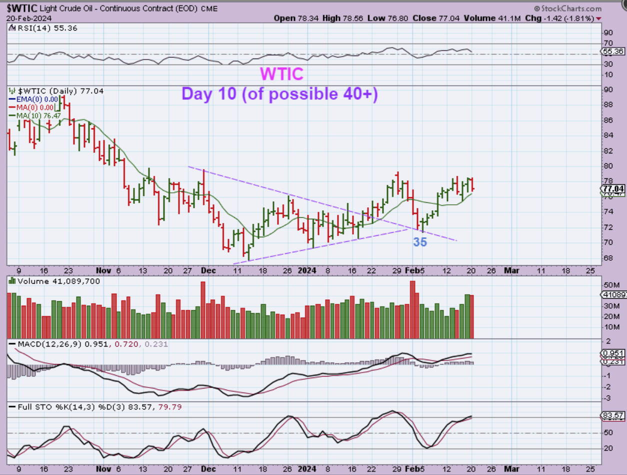 WTIC – Oil dropped on day 10 and it has been choppy, but the lows are in place so it is a long trade or a long set up.