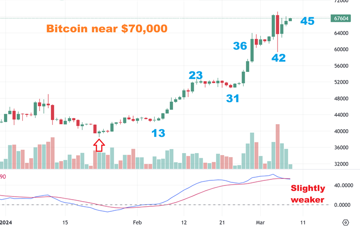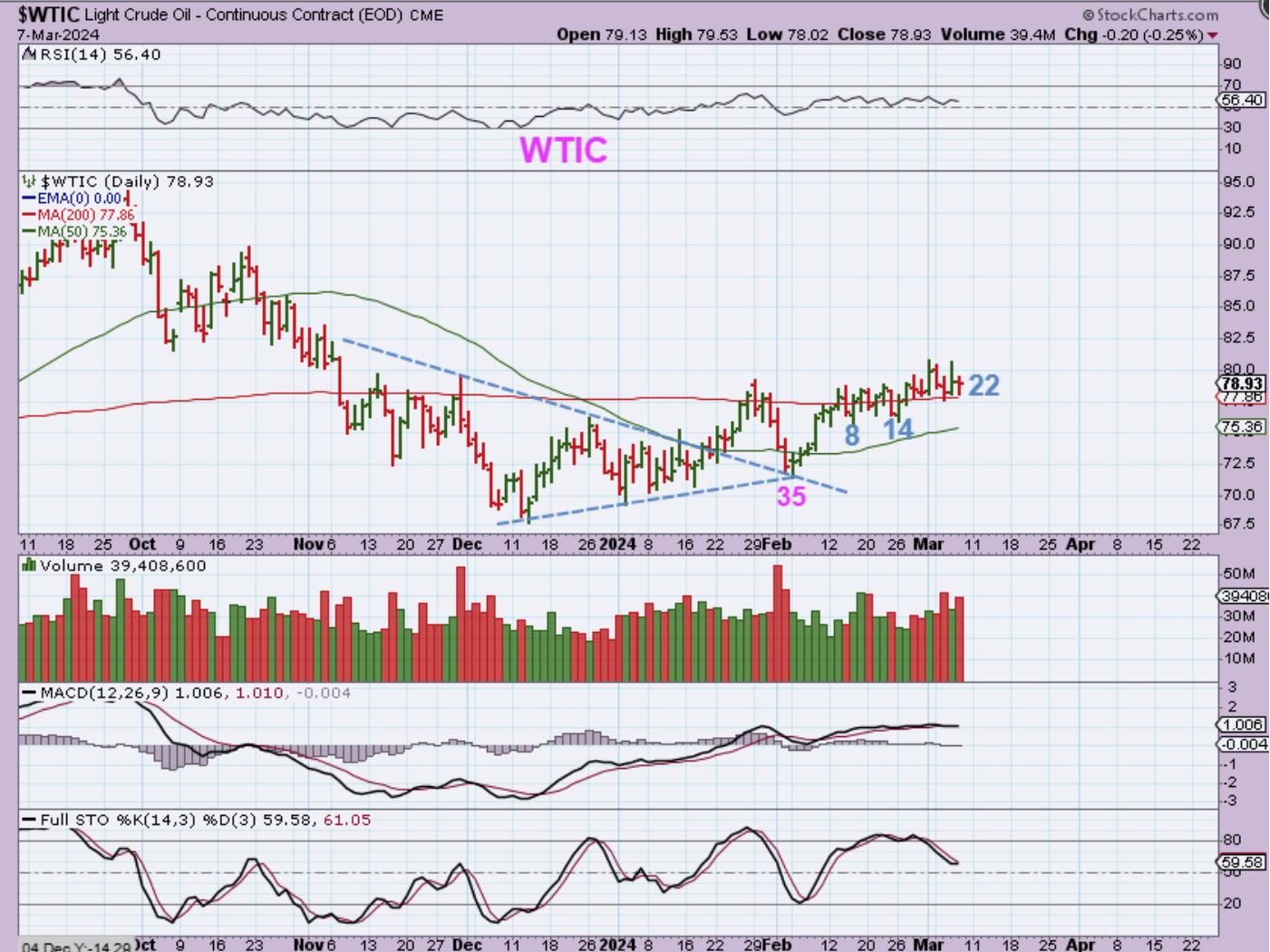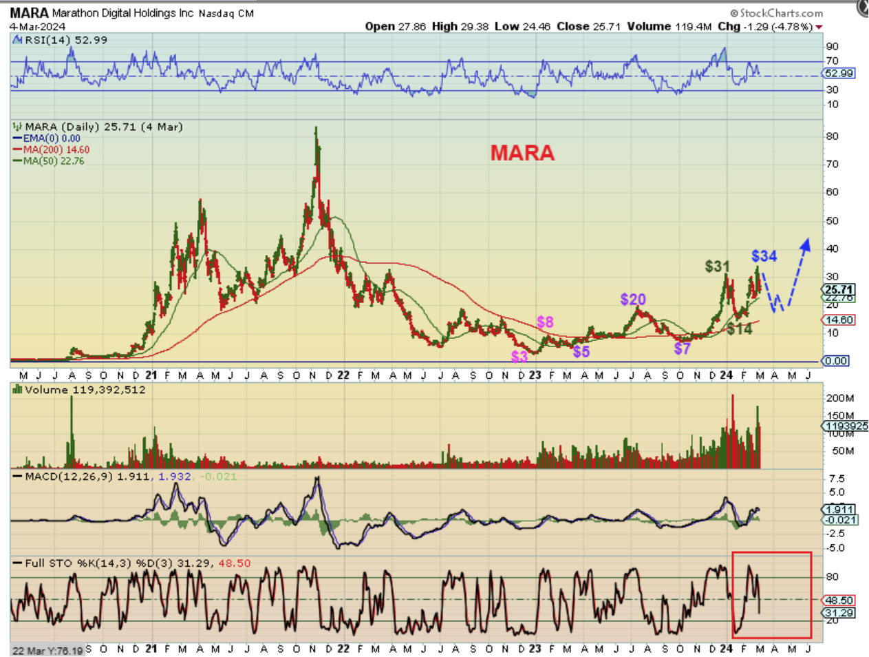 Bitcoin– Bitcoin is on day 45 out of the recent lows, and that is 45 out of roughly 60. We would then get a pullback and I’ll be watching the Crypto stocks to see how they set up at that time. It is very disappointing that Bitcoin at the $70,000 mark and MARA and RIOT not up at $45 or so, but you just have to accept what the markets present to you, and take it as it comes our way.