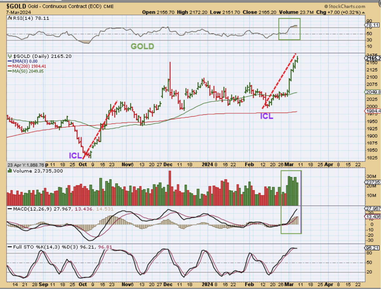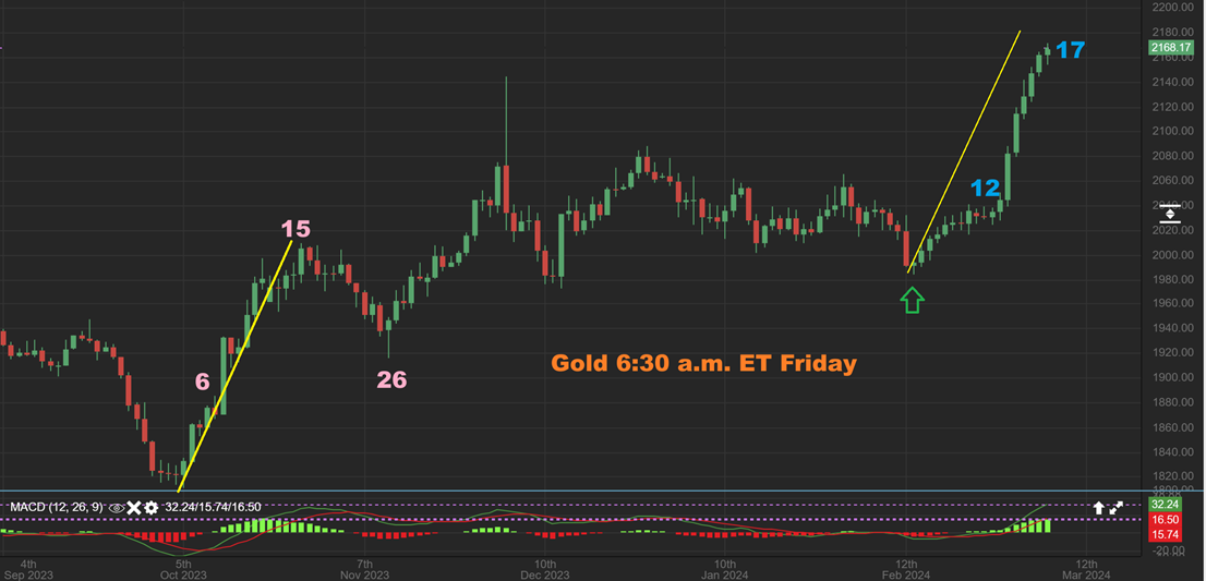 So today is Friday, the last trading day of the week. It is also day 17 for Gold, and right now at 6:30 a.m., I see Gold up again. Now we have a day 17 peak so far and that would make this R.T. most likely, and we do expect that with a first daily cycle. The length of the rally out of the ICL is now also matching the distance of the rally out of the November rally. Gold has made new all-time highs, so when this does dip down into a dcl, we will want to load up on Miners again if you either lighten up on the way up, or if you were light through this first rally.