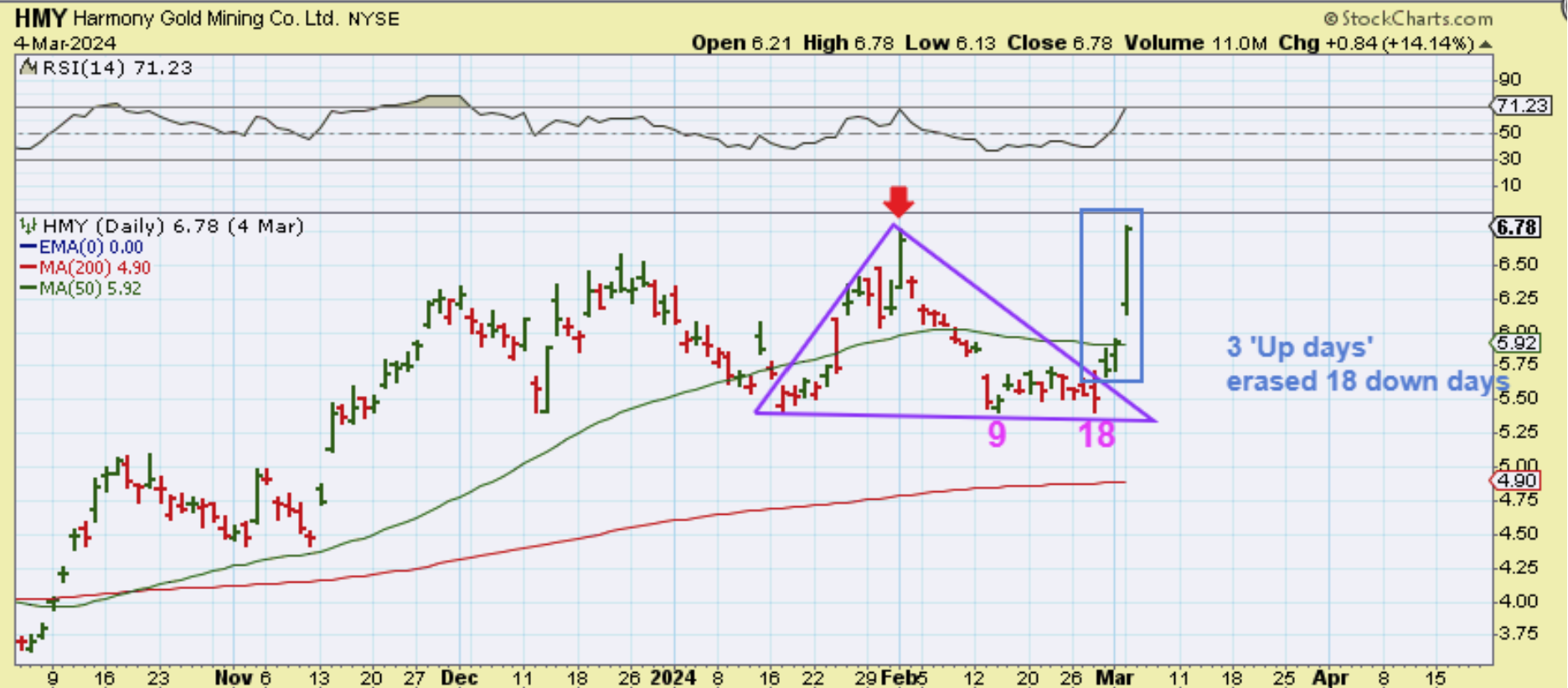 With HMY, we sold off for 18 days!! That is 4 weeks of sell off! Yet in 3 days the pain was erased!! This was March 4th, and HMY price is now higher than this too.