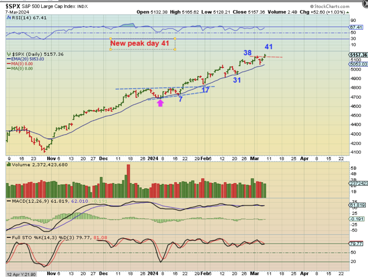 SPX – So we made a new peak on day 41 of the 2nd daily cycle.  THAT is a strong market. At one point I mentioned using the 20 ema as a stop, and so far you’d still be long the markets. I wish I took my own advice on that, and do you want to know why?…