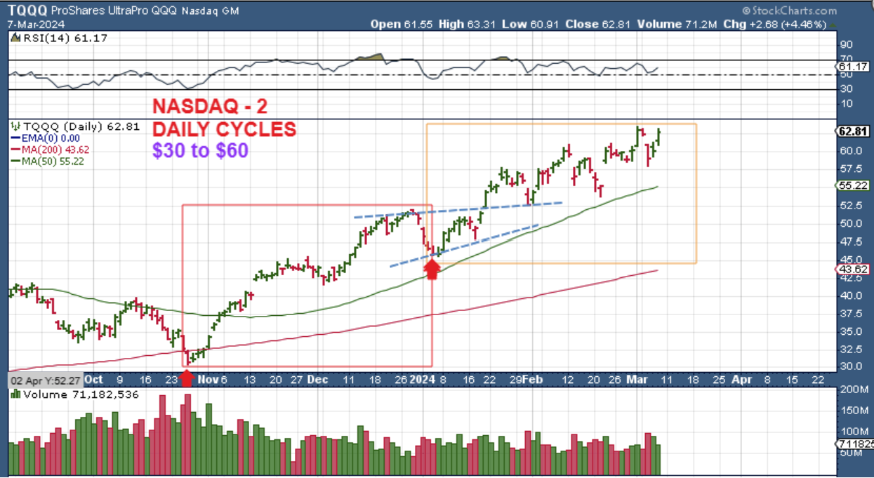 At one point I mentioned using the 20 ema as a stop, and so far you’d still be long the markets and if you chose to buy and hold TQQQ? You’d have doubled your money in a move from $30 to $63 so far. To be Honest, I don’t think that I could EVER REALLY buy a leveraged vehicle like this and just sit tight ‘buy & hold’ style, I just can’t…but I have seen this double and I have seen GDXU double several times in past from the ICL lows to the 3rd daily cycle peak.