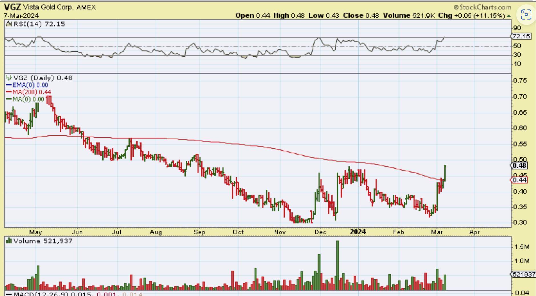 VGZ was lagging as it stalled at the 200sma. Well, it formed a pennant under that 200 sma and then it broke out yesterday and as was up 11%.
