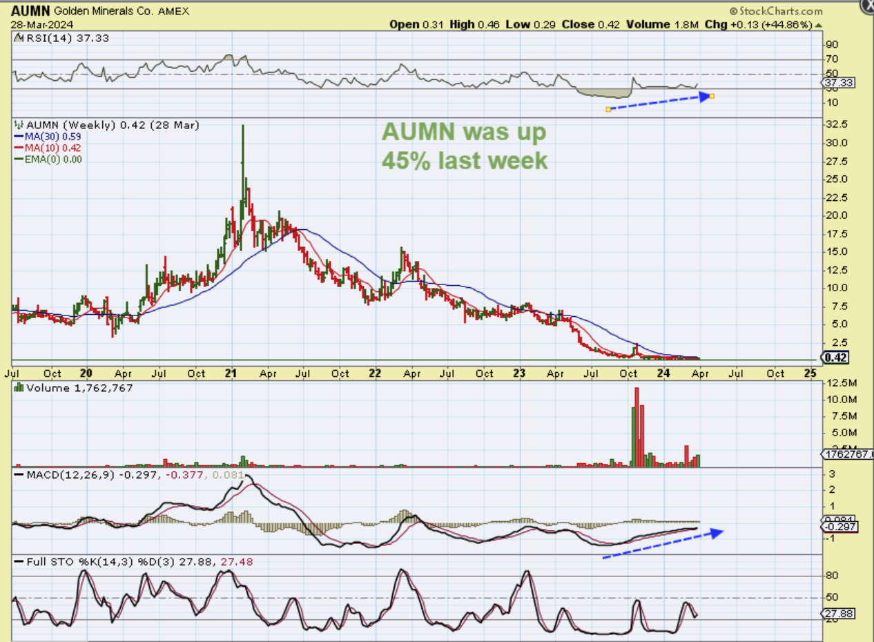 HL WEEKLY- Hecla broke from a downtrend and was up 14% last week. These are NOT waiting for Silver, and again, this has moved from $3.50 to almost $5 and looks to have plenty more in the tank. So…