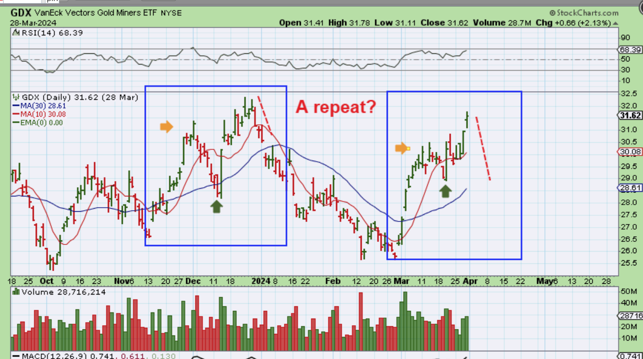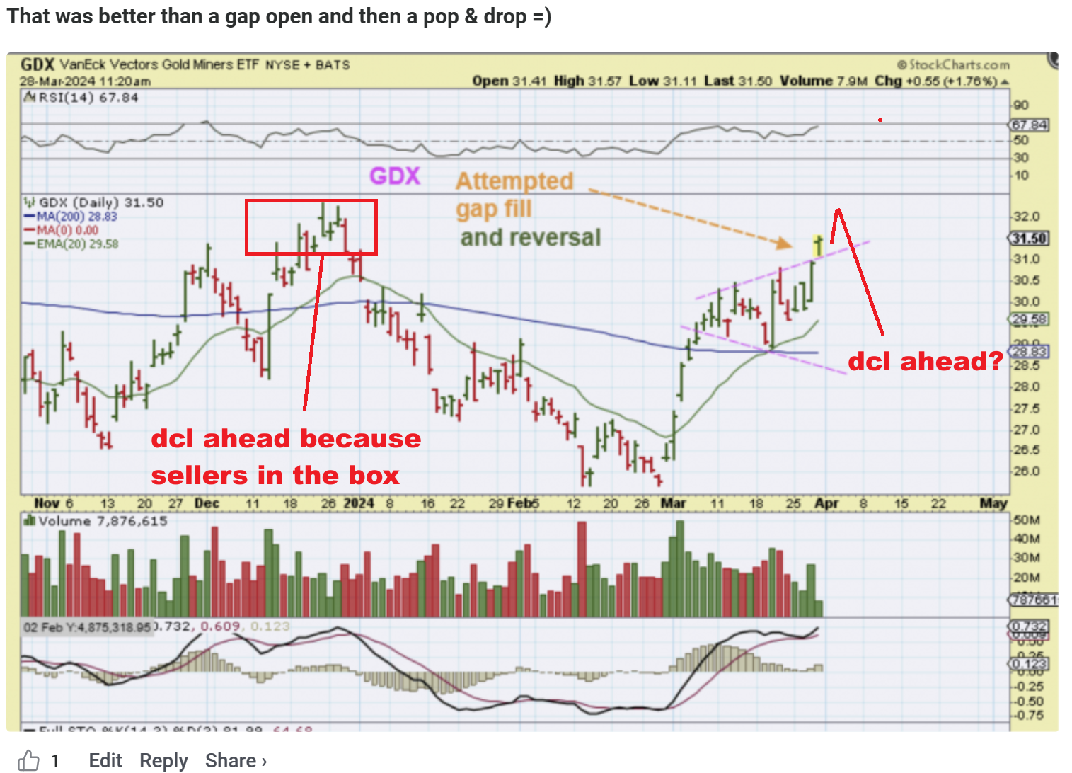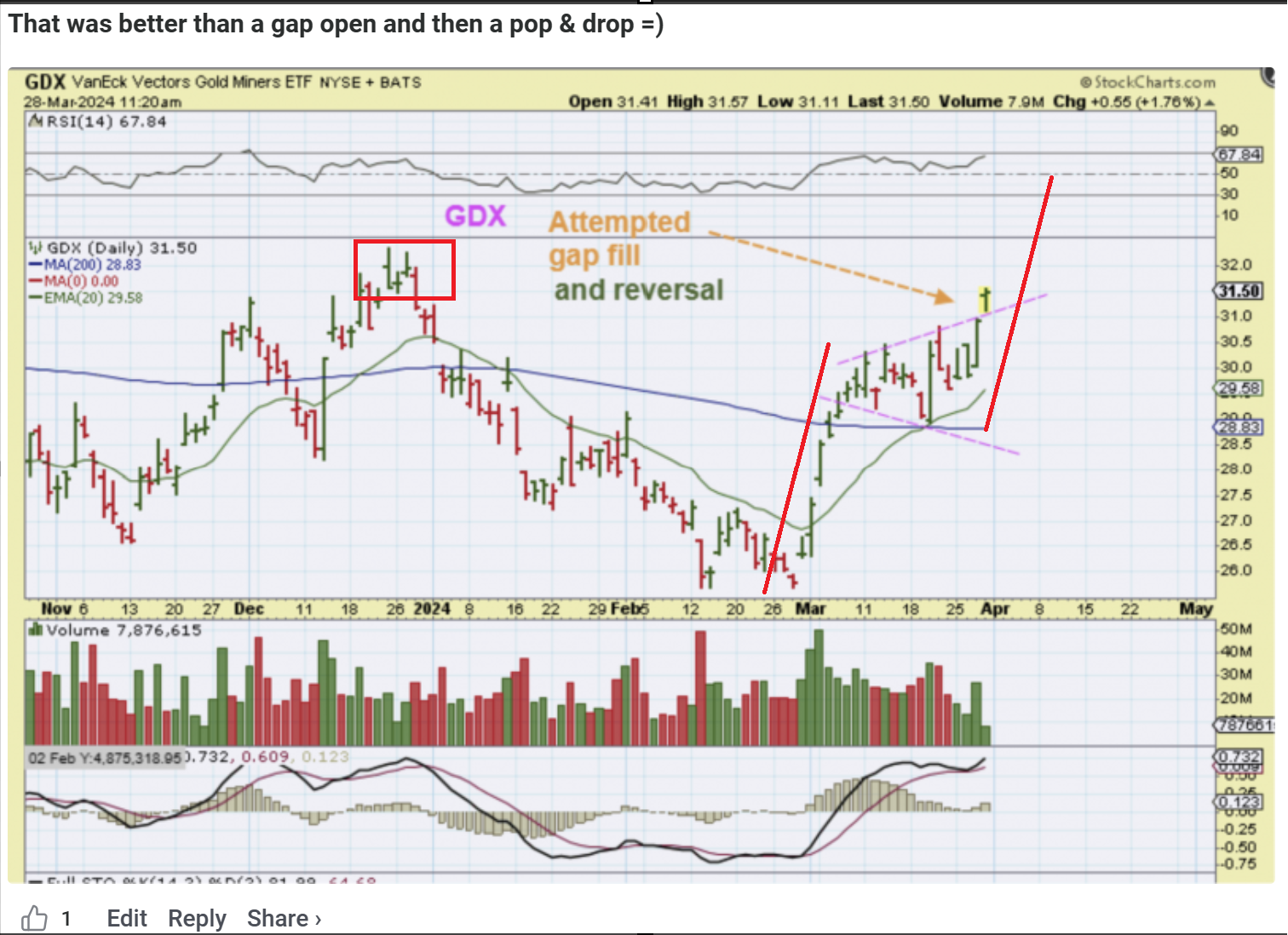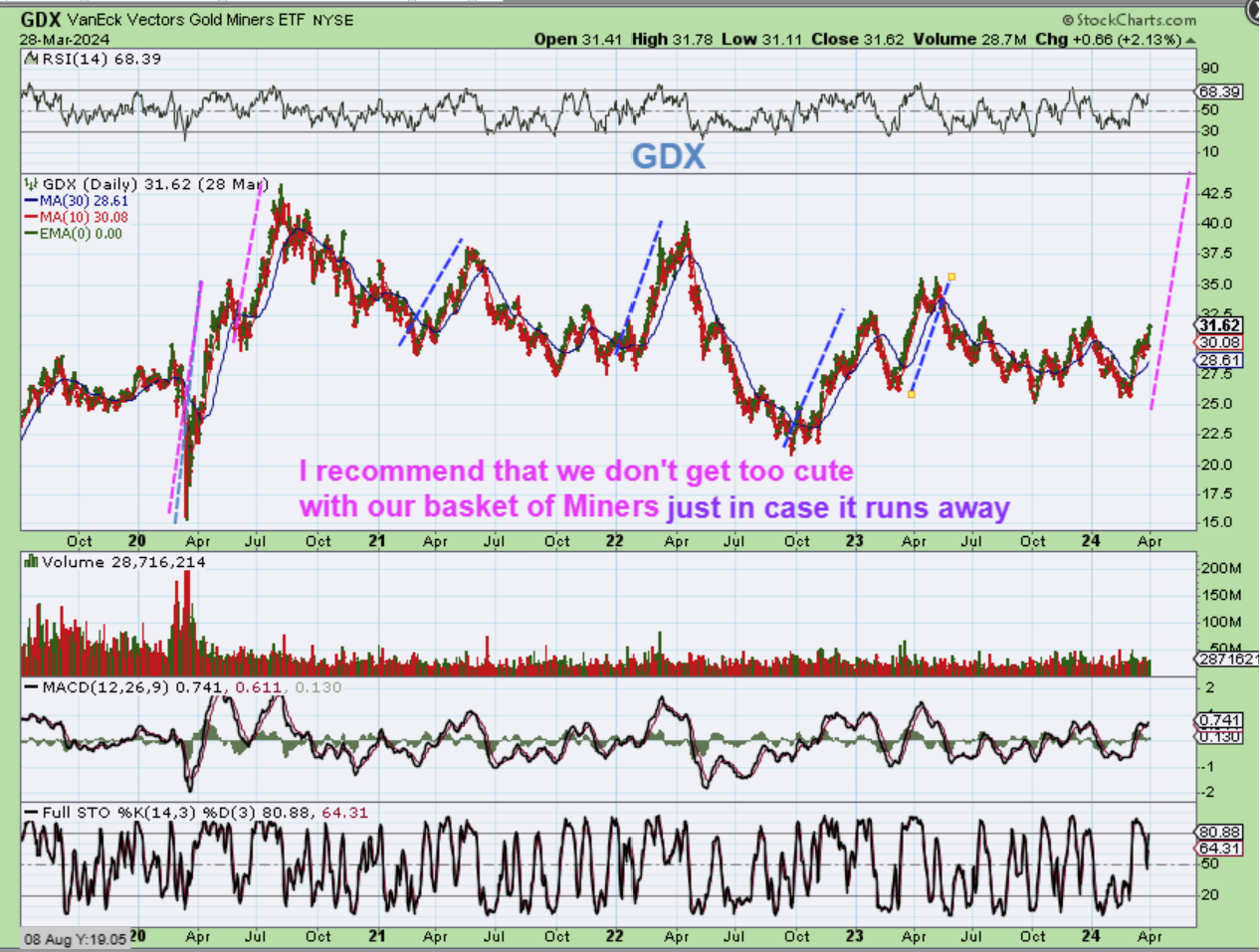 GDX DAILY- Take a look at the 2020 rally again. I am taking just that first leg up and placing that Magenta line where we are now. That is just the first leg up, and the 2nd leg up was a large straight up rally too. Also…