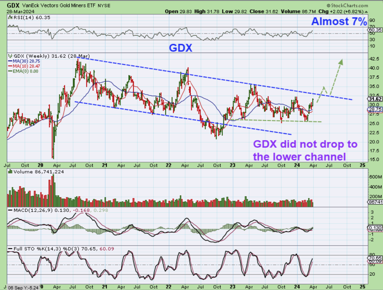 GDX was up 7% last week and it is heading up to a downtrend line. Since it did NOT make it down to the lower downtrend channel line, it could still have the energy and strength to break out without pause.