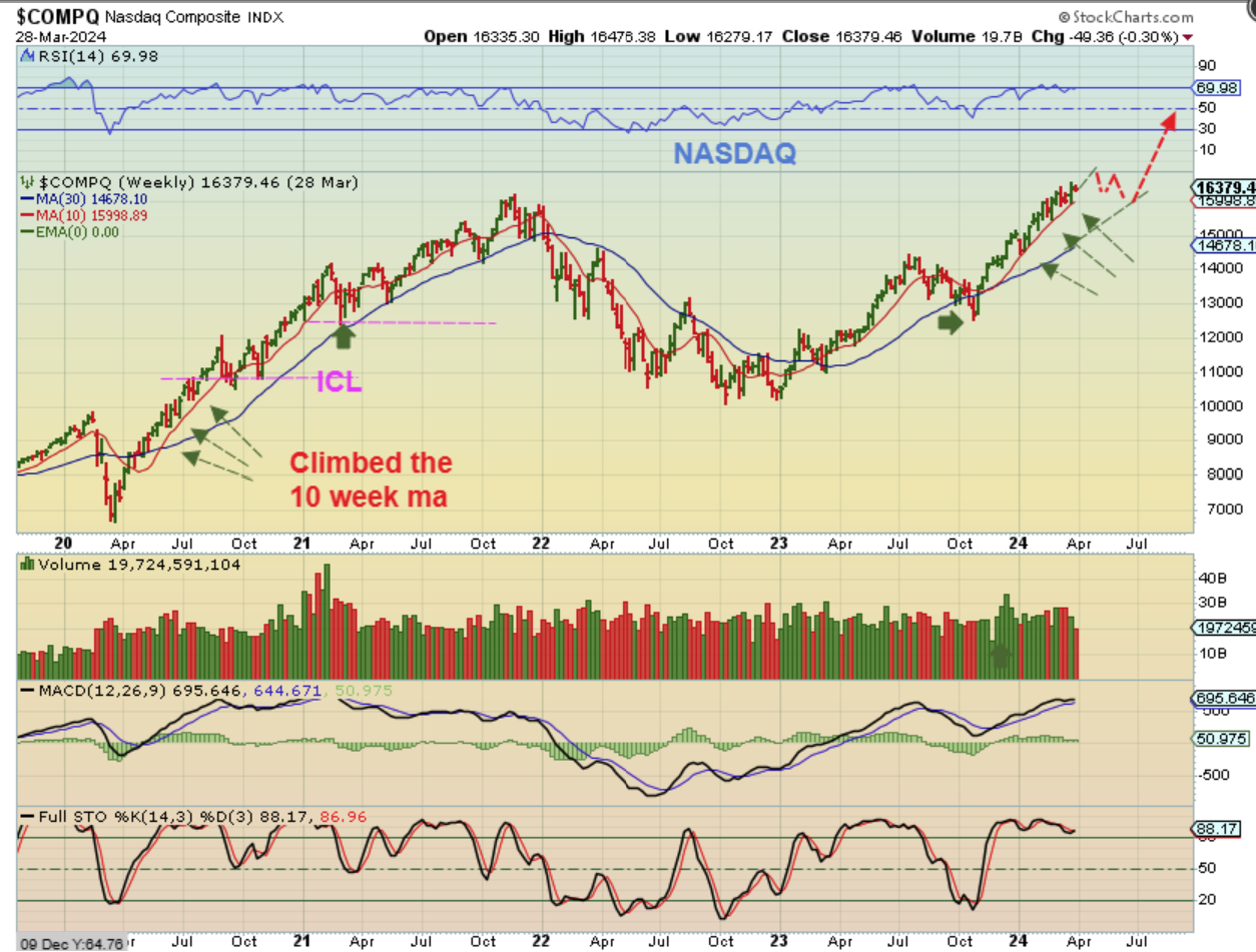 NASDAQ WEEKLY– I went back to the NASDAQ, because I can clearly see 2 ICLs that formed in a strong bull run. What I am seeing is not exactly a very deep drop (it was sharp though), and it became a 4 week drop to the low. I see an area that is choppy and sideways as it worked its way below the red 10 week ma, and gradually tried to get over to the area of the blue 30 week ma. One more thought…
