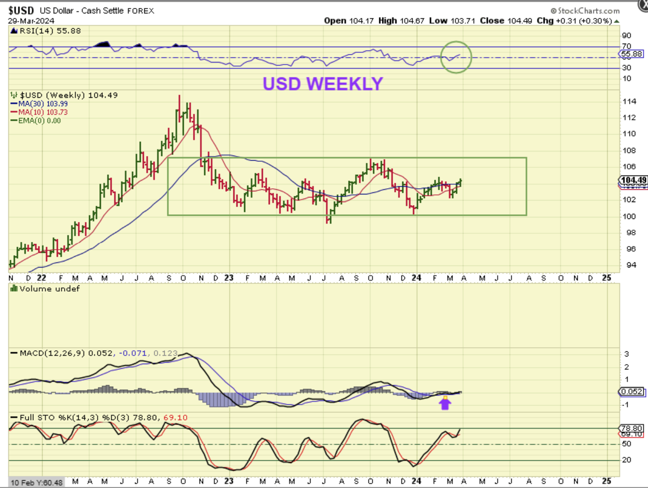 USD WEEKLY– I have been saying lately that the USD looks rather bullish here, but it is not hindering the Precious Metals Sector. It could still be that the USD rolls over soon, dropping into an ICL eventually. Whether or not that happens, I think when you see Gold you will agree that it hasn’t mattered what the USD has been doing…