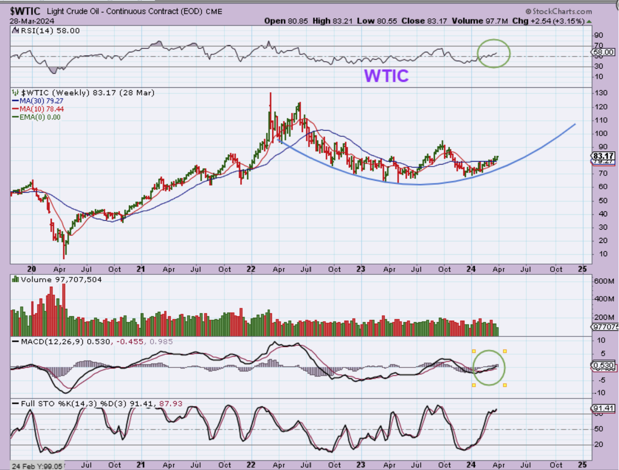 WTIC WEEKLY– I think that Oil is starting to build the right side of a round bottom base. Oil prices are slowly rising up, but as noted in past reports, the Oil Stocks have taken the lead and are doing well.  In fact…