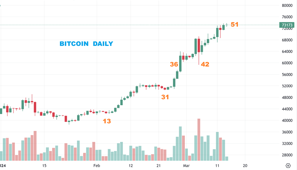 This is a live shot of Bitcoin at 6 a.m. ET. and it is a strong bull run on day 51 of roughly 60!