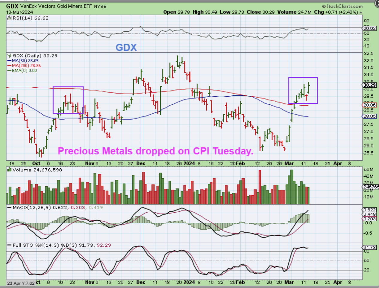 GDX could continue on to the prior highs too, especially of the PPI Numbers give this sector a push. This also could be a topping process, as mentioned yesterday, and as seen with the 2 purple boxes. The CPI Numbers on Tuesday caused GDX to drop. That could repeat.