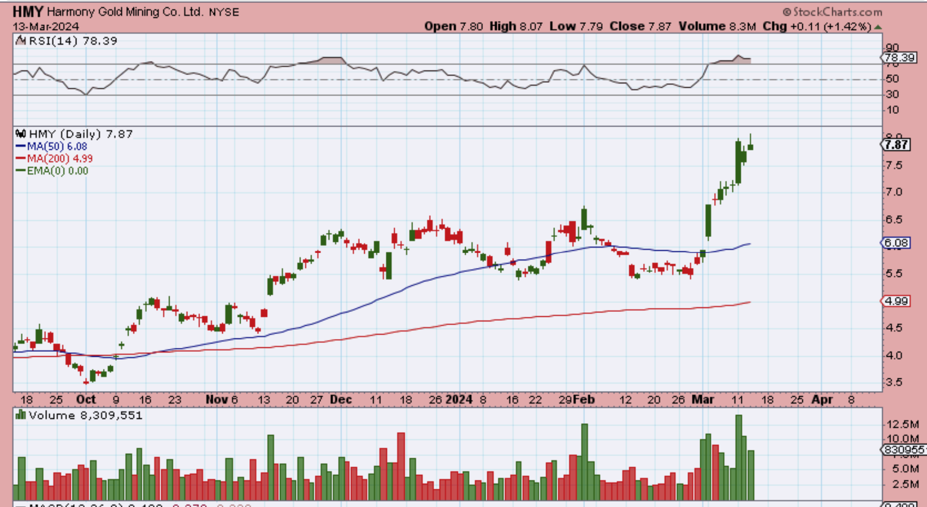 HMY has been very strong, but notice that it popped and dropped yesterday, only up 11 cents by the close. I saw others do this too. We really had a mixed reaction yesterday, and this seems to indicate that a pull back is near.
