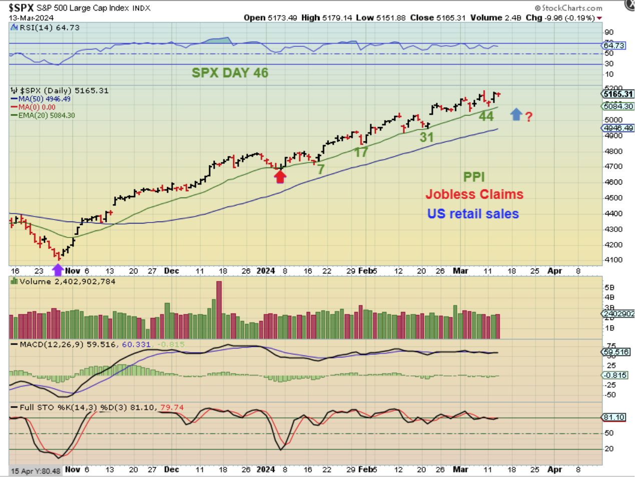 DATA seems a bit heavy today. On Tuesday we had the CPI (inflation Numbers) and the General Markets rallied while the Precious Metals dropped. Today we have the PPI (Inflation numbers), so we MIGHT get the same reaction, but with Jobless Claims and US Retail Sales added, the General Markets could dip. The ONLY reason that I say that is because we are so very due for a dcl 🙂