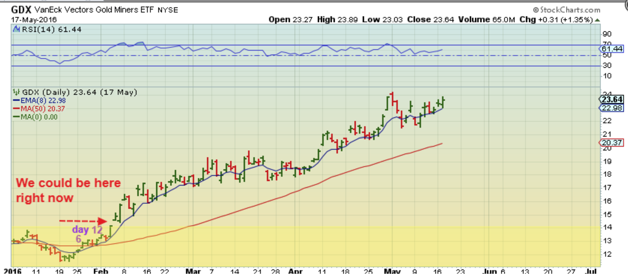 Using the 2016 bull rally for precious metals, you can see that the dips were VERY SHALLOW for a long time. If you didn’t own Miners near the lows (even by the day 12 mark, which is about where we are now), it never pulled back below that price. Buyers just kept jumping in and possibly we saw short covering taking place, and Miners ran away from those without any position. So for this reason, I do think that a dip should be bought so that you at least own ‘something’ if this runs away.