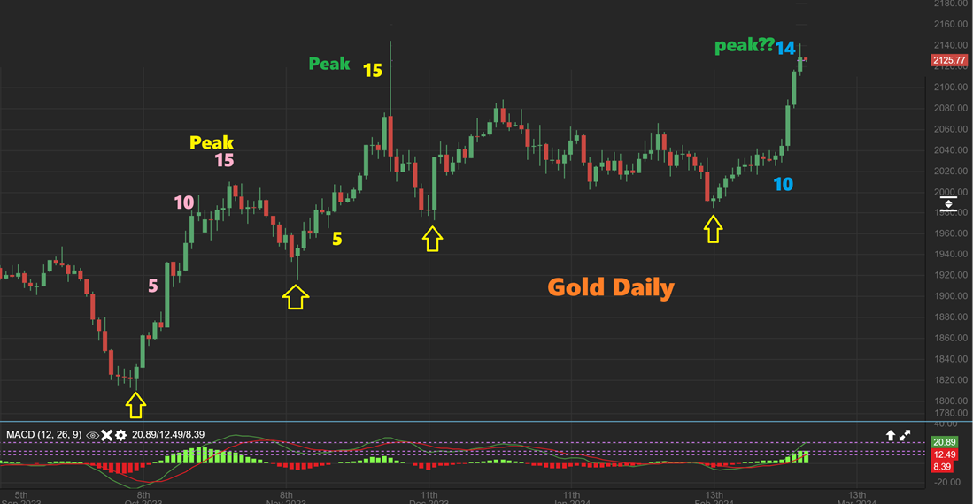 When I look at the daily GOLD chart, I can’t help but to notice that with the last intermediate cycle, we had shorter daily cycles and therefore they peaked at day 15 twice. Today we are on day 15, so…