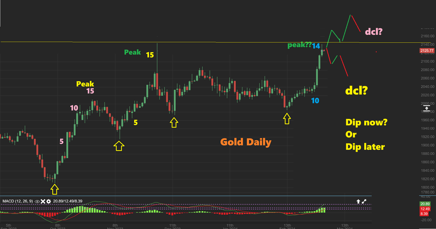 It may just be safer or easier to deal with if you start buying a small basket for starters and then add on the next dcl. This way, if you enter now and price chops and drops into a dcl by day 25 again, the damage is minimal, it will be erased on the next rally to a daily cycle #2 peak, and you can add on that dip knowing that.