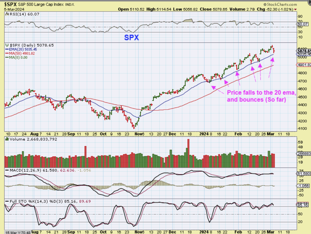 THE SPX – We do see obvious support at the 20 ema, but I would expect that we will see that broken as we dip lower into that dcl. Today Chairman Powell testifies before congress at 10 a.m.