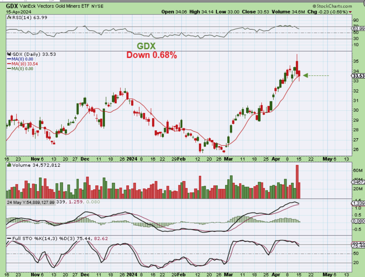 THE MINERS, or THE GDX ETF sold off sharply and then started to bounce back. It actually closed 1 penny under the 10sma. In my analysis, this is still preparing to sell off, even if it bounces.