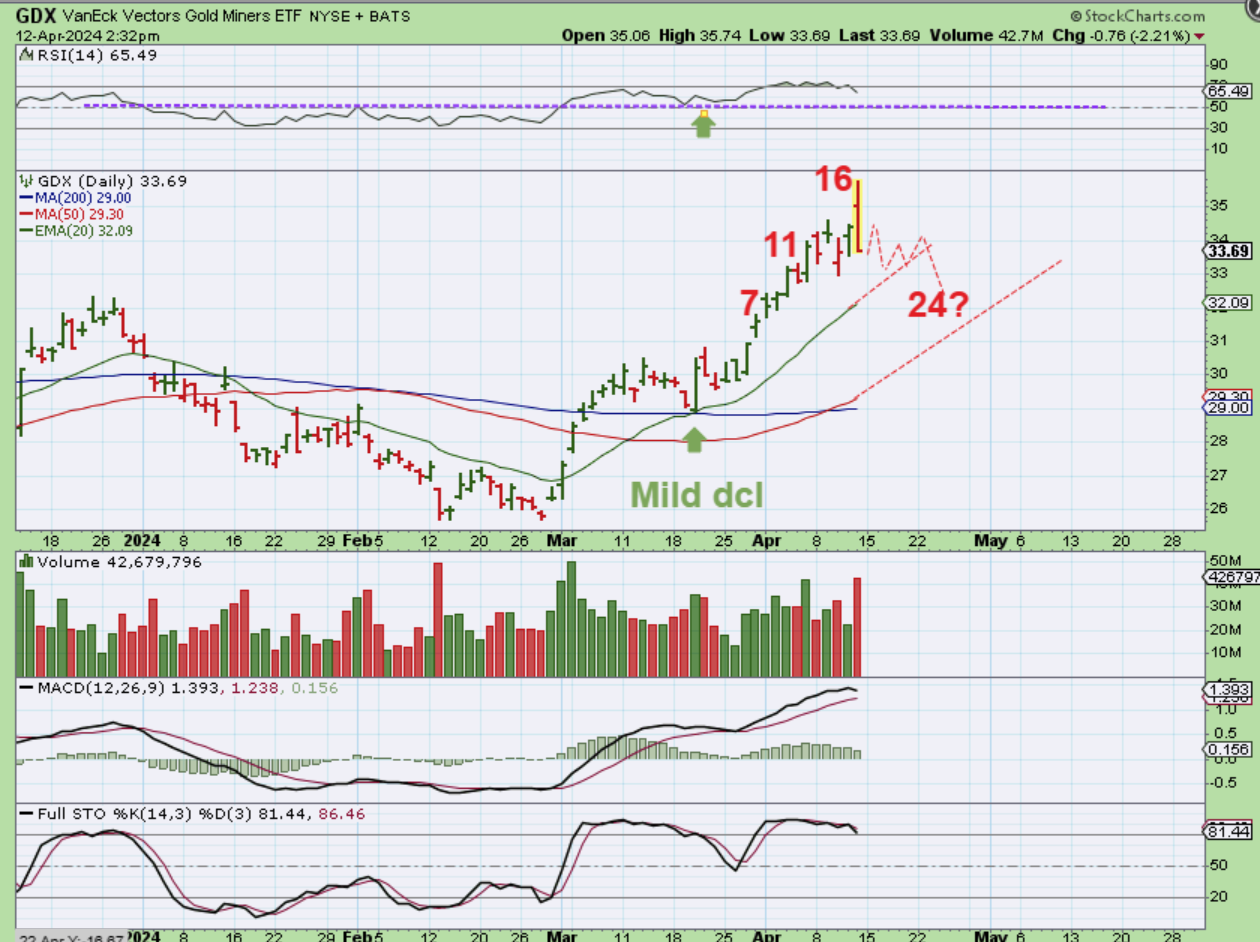 So we do see that The General Markets and our Miners started to drop lower, as expected. It is time to seek out a dcl and eventually an ICL over time. This can take some time, since there will often be bounces in between the dips and this kind of choppiness can make for boring times, unless you go short or day trade. Keeping the bigger picture in mind can help. We are looking forward to buying the next dcl in Miners, and that can be when the timing enters the day 20+ period, then we’ll see if the Miners can make new highs in the 3rd daily cycle.