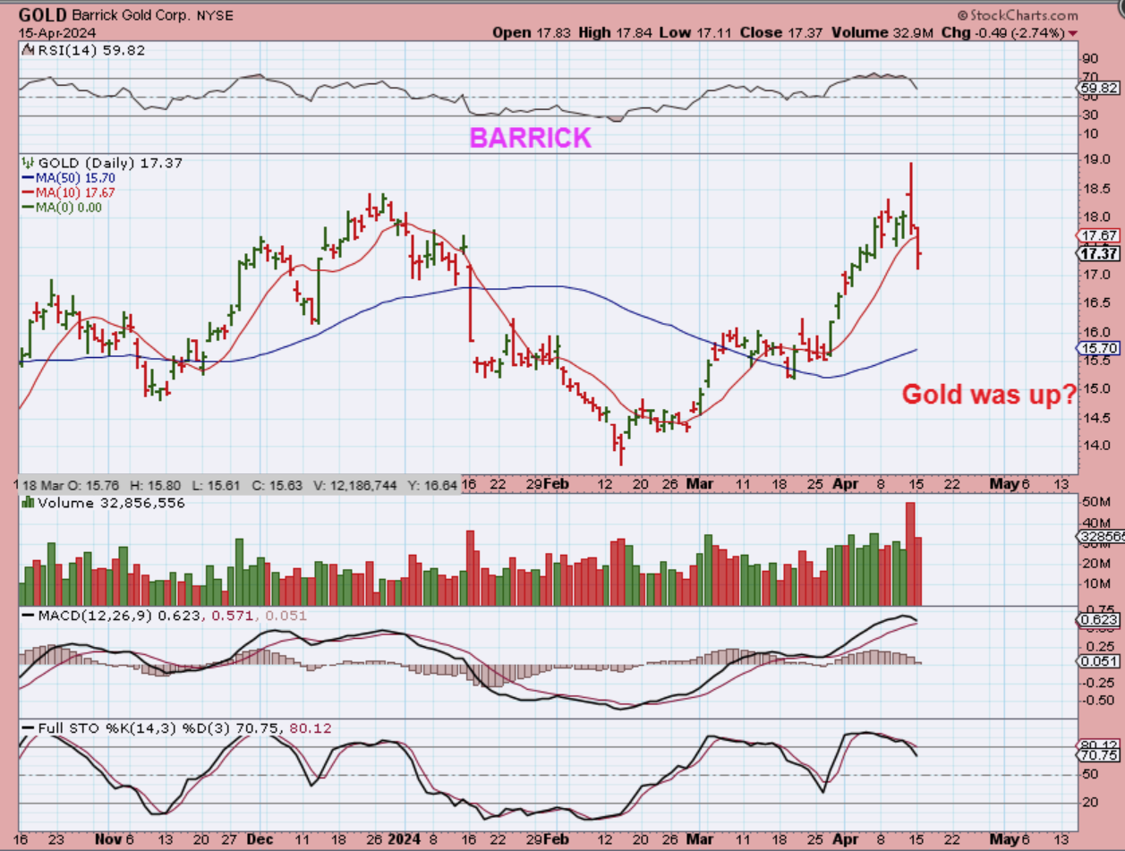 BARRICK – Gold itself actually ran from a low of $2324 to $2392! THAT is a $68 move higher in Gold, and yet Gold stocks were Red & just not buying it.