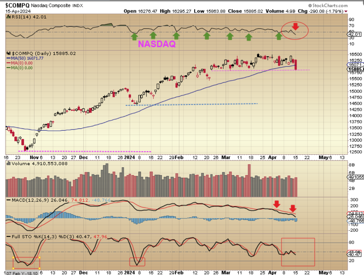 THE NASDAQ broke the March lows too. These are considered failed daily cycles and start to trend lower. Please take note of the RSI and MACD changes too.
