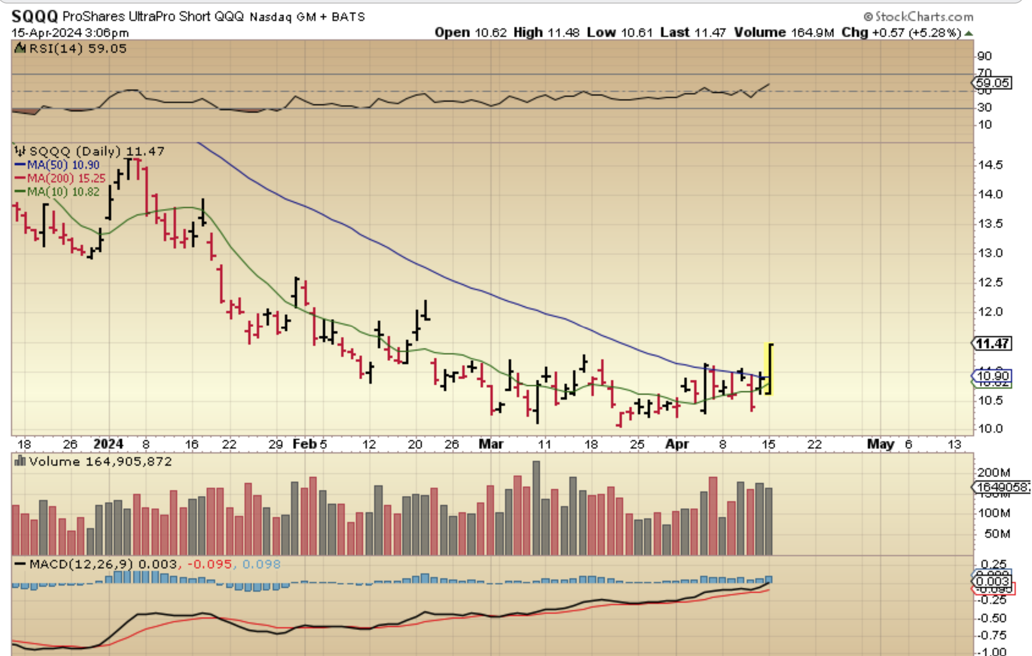 As the SPX & NASDAQ crawled above the 50sma, The SQQQ was bullishly crawling under the 50sma too, but now it broke out on Monday. This was a buy on Friday or Monday, since we are expecting the sell off If the General Market bounces with a half cycle low and back tests the 50sma as mentioned above, that would offer another entry in SQQQ, SOXS, SPXS, etc.