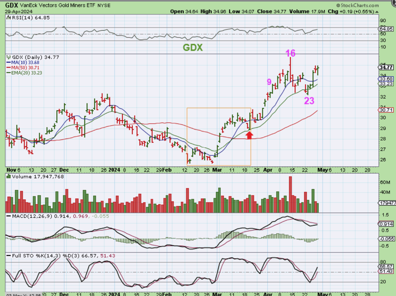 GDX has a day 23 low. COULD THAT be a dcl? Well, it could and it actually started to look like one last week when Miners suddenly started to run higher. This count is clear with a day 23 low and a bullish surge higher last week, but because Gold & Silver can drag Miners around, we need to be cautious. I do want to show you one final thing, just so you do understand how much of a mixed set up we have here…