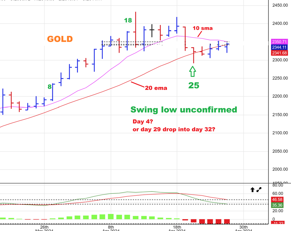 GOLD – As a close up, Gold appears to have a day 25 dcl, HOWEVER, past dcls were always around day 32 or so. We started getting shorter daily cycles when Gold became very bullish, but right now we do NOT Have a confirmed dcl and price is struggling at the 10sma & 20 ema. Could this head south? Yes it could , but it should be rather short lived if it does. ALSO WE REMEMBER THAT SILVER looks to be earlier in its daily cycle.