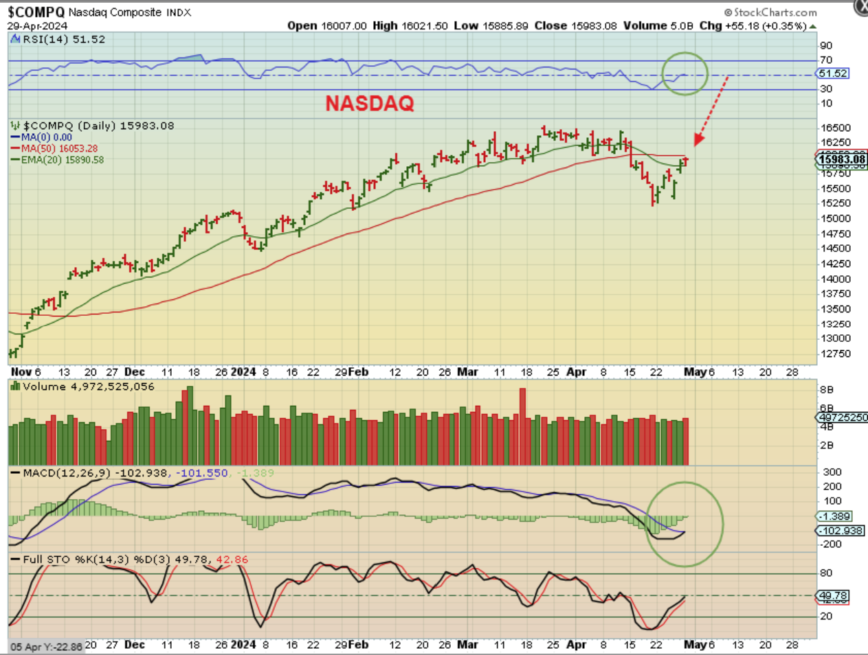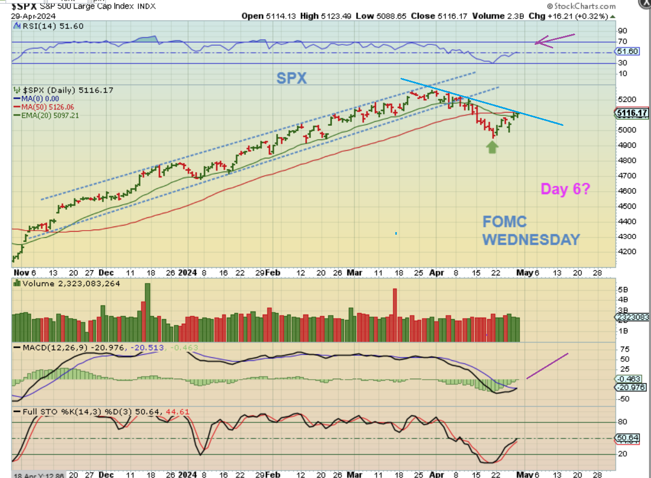 The NASDAQ has also bounced to the 50sma and this is actually where I was thinking of going to go short. I’ve been using the SOXX for clearer dcls and the cycle count and we do still have ‘time’ left for another drop. If the Fed were to say that he wants to cut rates soon, this could rally, but if he mentions that increase in inflation and no rate cuts needed, this could sell off.