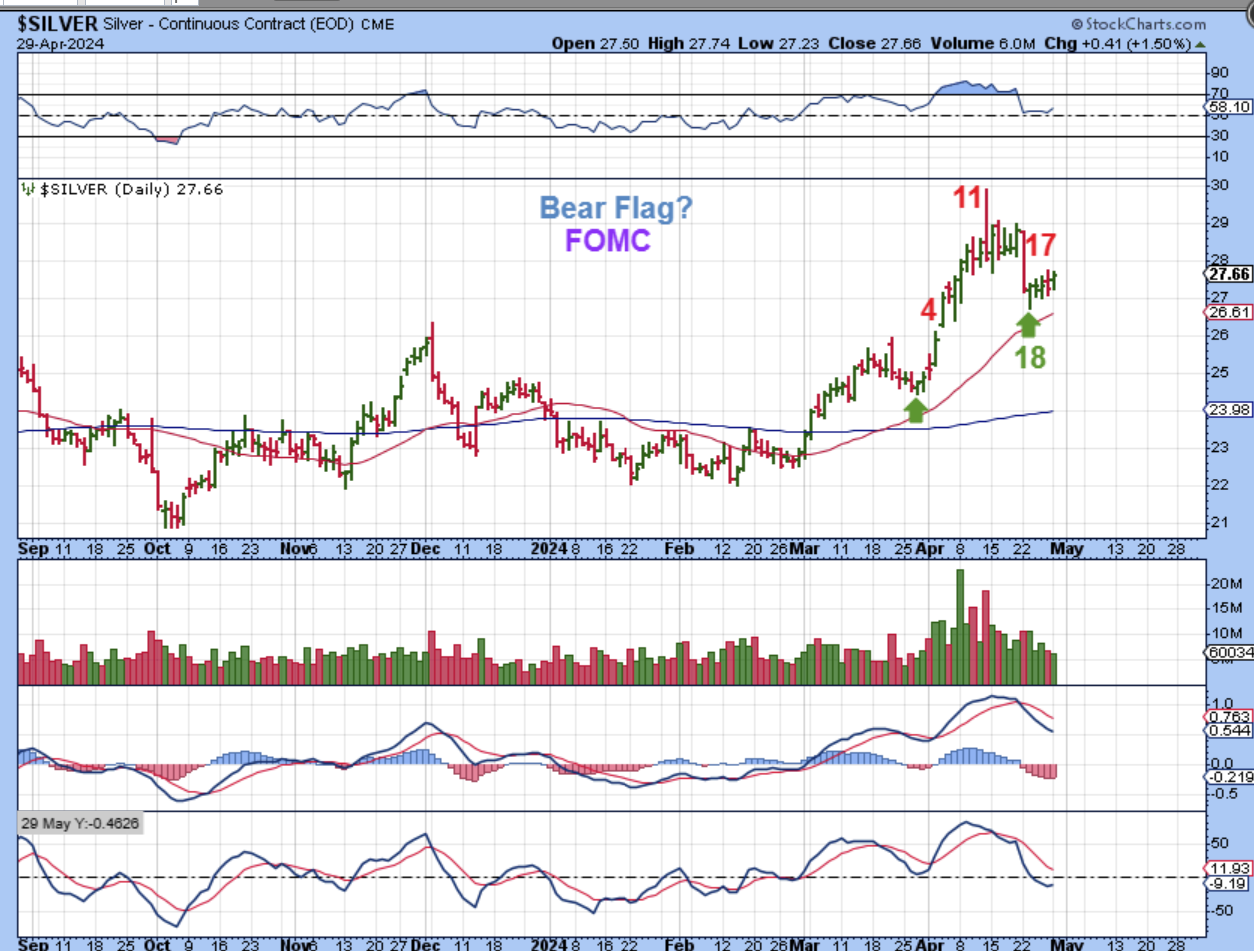1. We just saw that Gold could have a dcl, and the last several were dcls in this time period (25 day), but it wont break higher and is under the 10sma and 20 ema. Inflation may change the Feds stance, and Gold seems to have been running on a rate cut chatter.