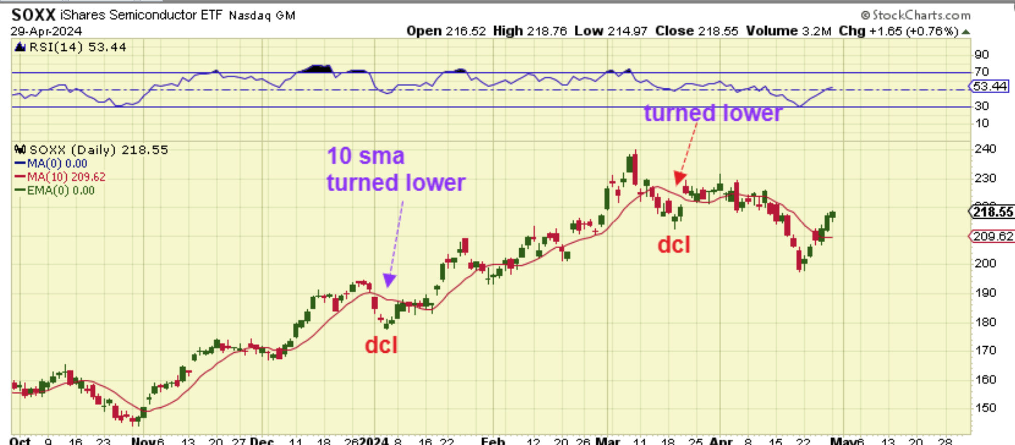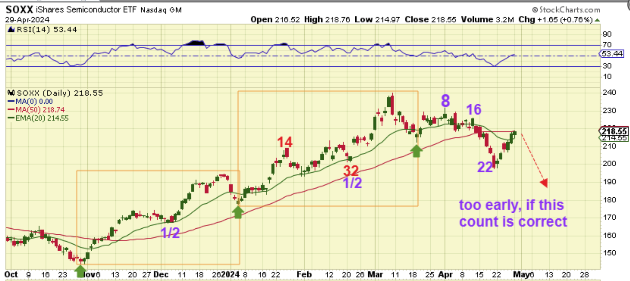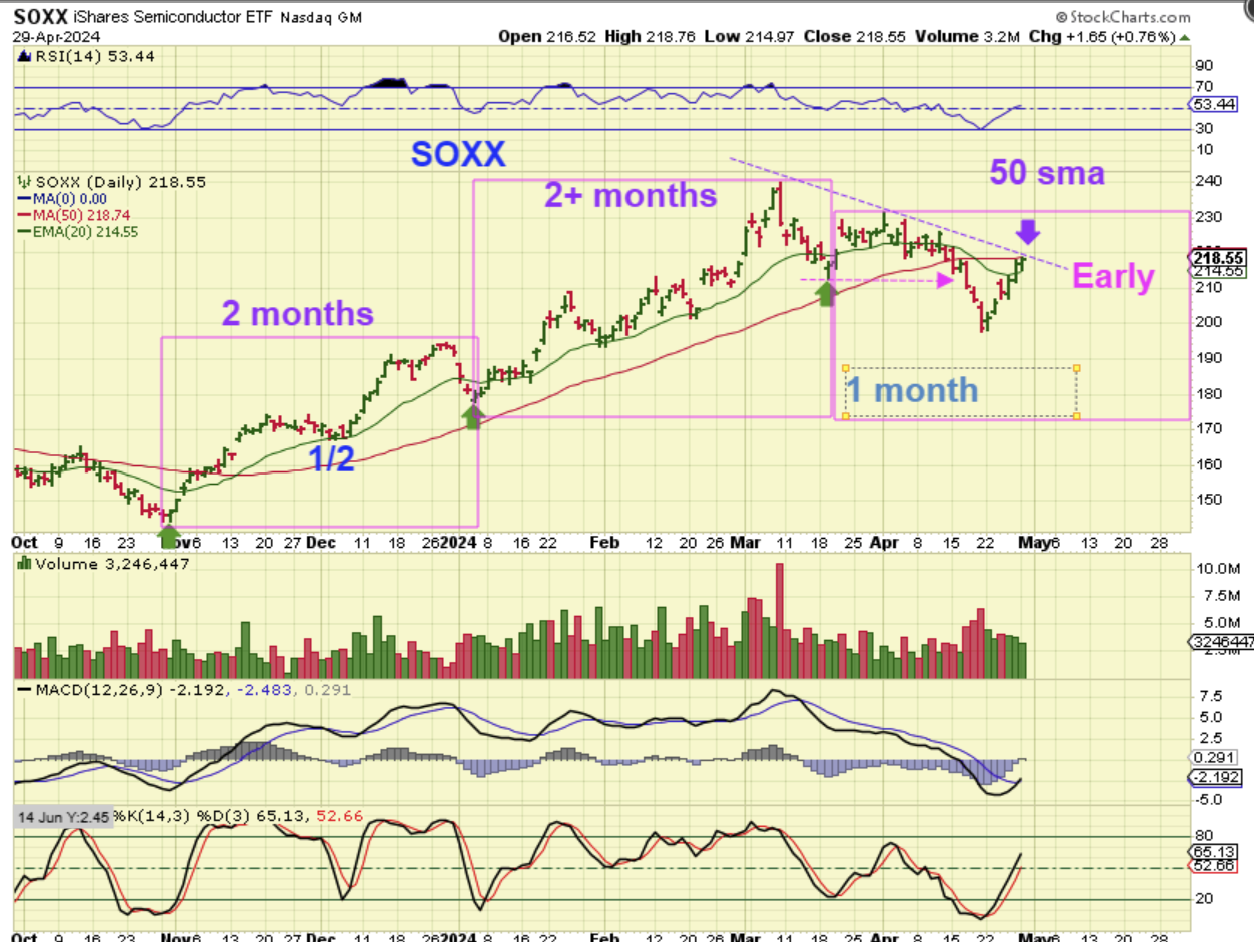 The SOXX has made clearer DCLs (lows) and from this chart this looks too early to have put in a dcl. This looks like the timing for a half cycle low. In other words, all of these charts ‘bounced to the 50sma’ and the downtrend, but they look ready for another leg down, and this could start anytime around that Fed Mtg. So…