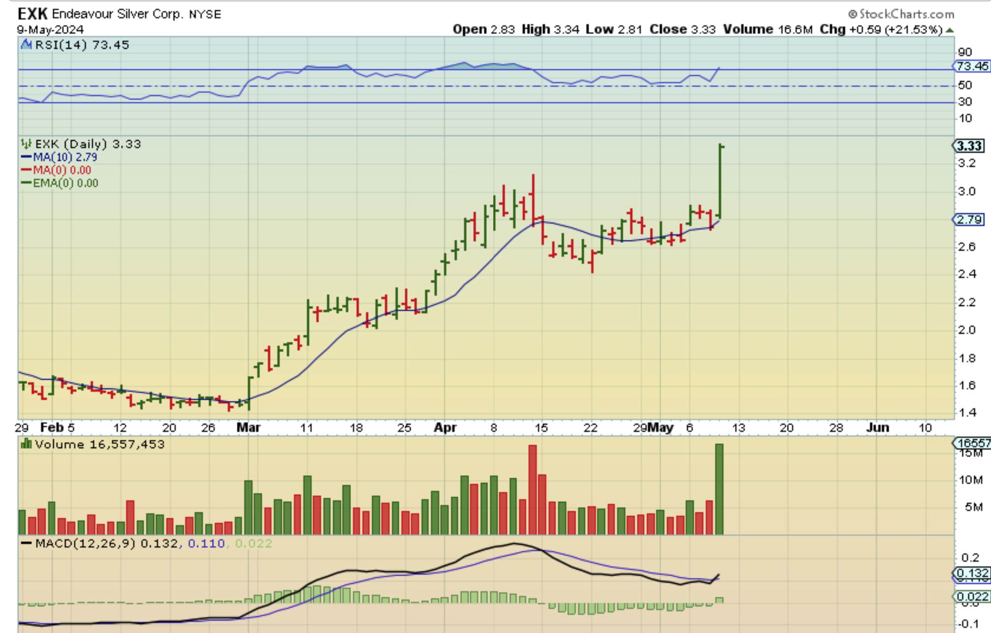 EXK released earnings and did a small gap open, but it just kept on climbing all day long.  HL & PAAS did this too, so the Miners that are releasing good earnings are a nice target once they start moving higher. I say that because MUX released bad earnings and gapped down and sold off all day to ‘down 15%’.