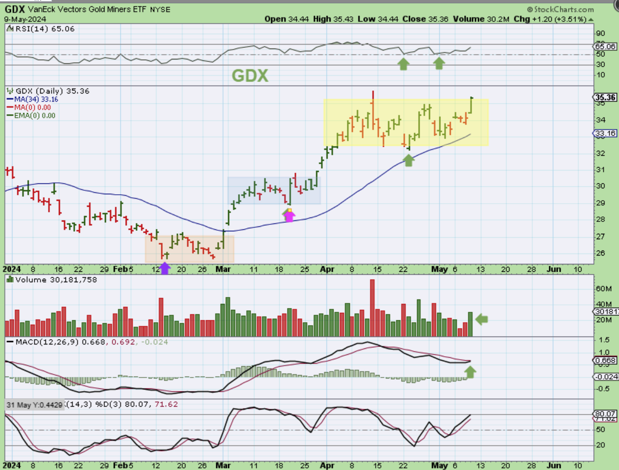 GDX – The Miners followed through higher and this has been a nice consolidation to break out from. With Gold and Silver only on day 4 & 5,  they can run through next week and only be on day 10 and 11. Miners should make a run higher from here, simply based on the past 2 runs from those consolidations and the dcls in both Gold & Silver.