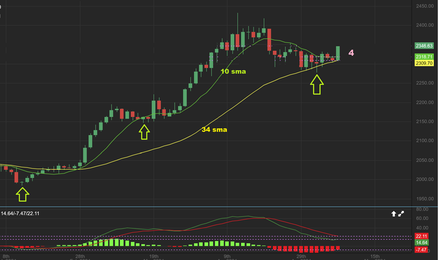 GOLD – HEY!!  We got our POP in Gold on day 4. Notice how price bullishly climbed right up that 34 sma. We were just waiting for some buying to push us away from that dcl and confirm a swing low by closing convincingly above the 10sma. Gold gave us plenty of time there to build a basket of miners…again. 🙂