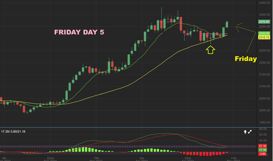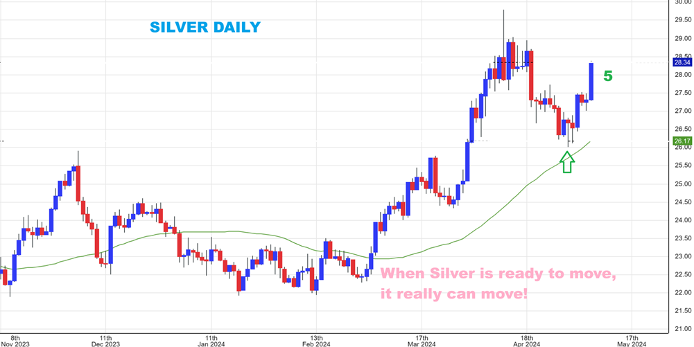 SILVER surged again on day 5 and when Silver is ready to go—it Goes!  Very nice.