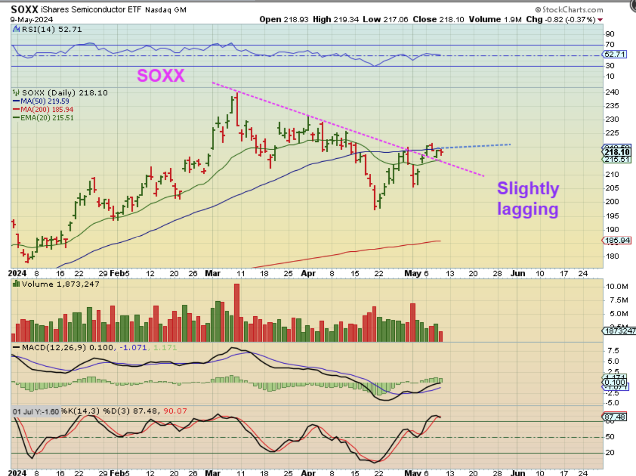I noticed that The SOXX is actually still under the 50sma, so it seems to be lagging. You could buy it with a stop under the green 20 ema or even wait for a break of the 50sma and place a stop there. With this set up, SOXL could become a good trade, but only for short periods of time.