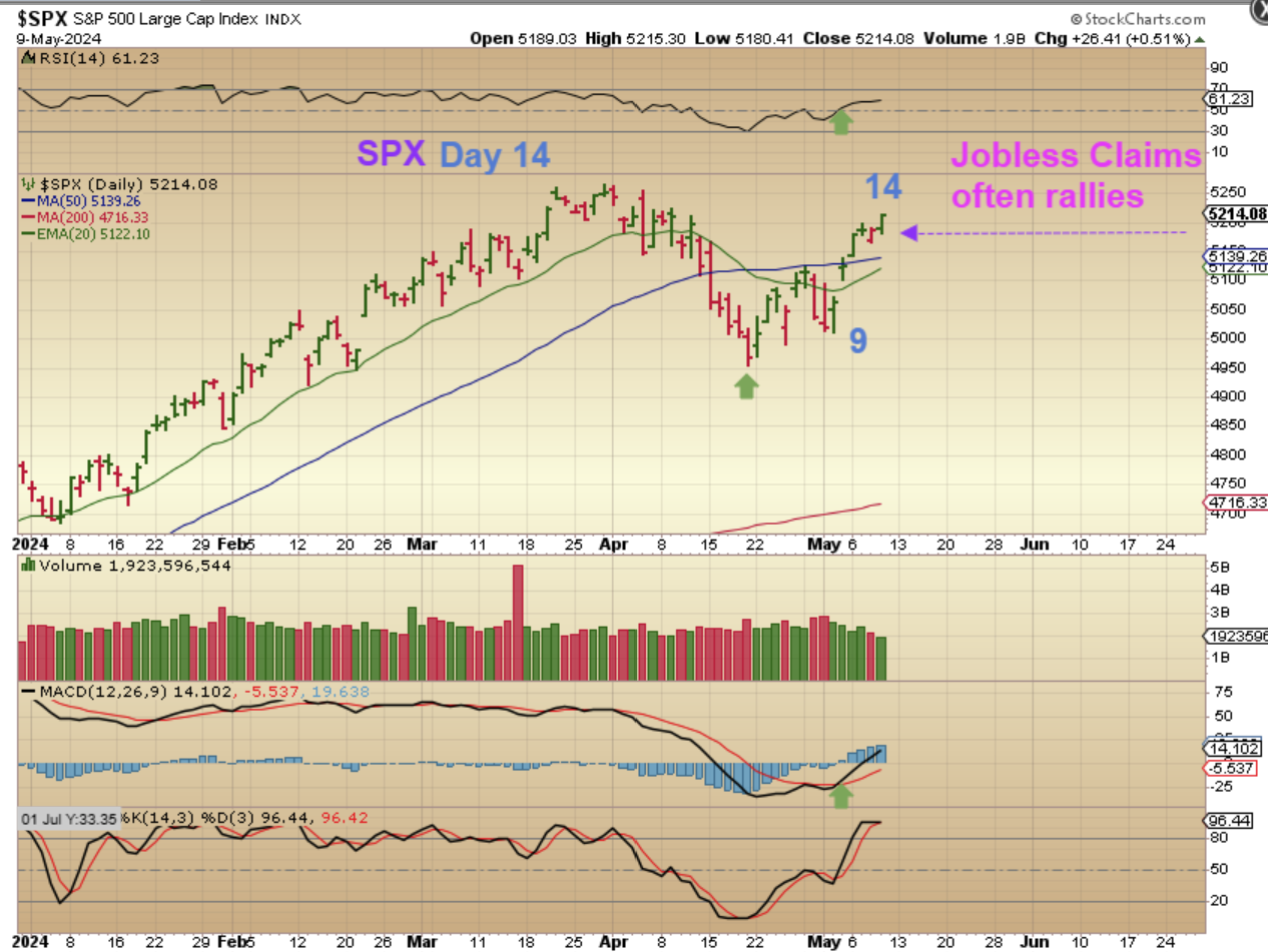 SPX – We did see some upside after the Jobless Claims , as expected. This is only day 14 out of an ICL, so we should have plenty more upside over time.  If you didn’t buy in at the lows or down at the 50sma as a low risk entry with a stop, there is another possible low risk entry…