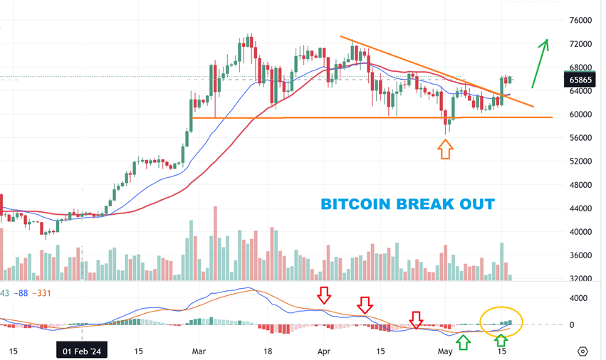 BITCOIN – By the close we see that Bitcoin not only broke above the downtrend and 34 & 50 sma, but it kept pushing higher and now has a higher high with strong volume.