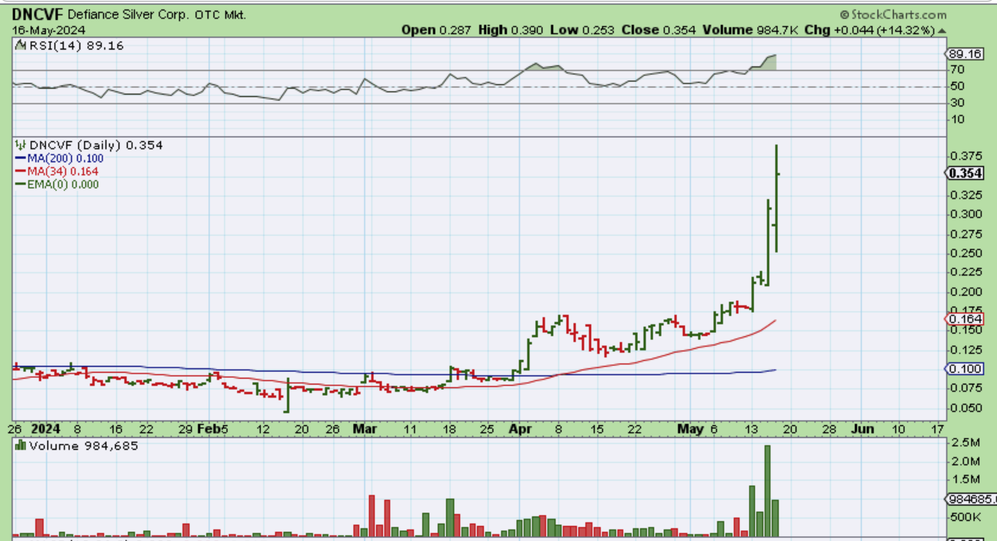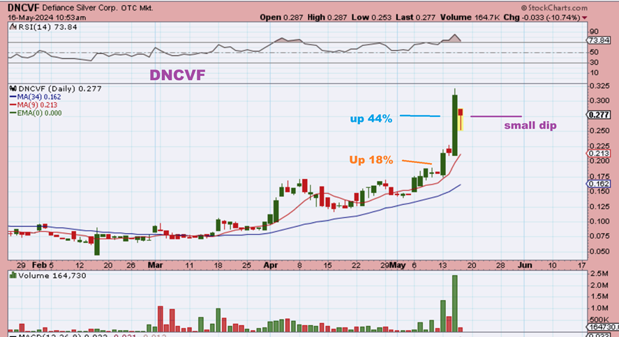 DNCVF broke out and shot up 18% on Monday, red Tuesday, shot up 44% on Wednesday, and was down 10% on Thursday. It was actually down a lot more, and I was posting this to show that it looked normal to me—just a pause in a very strong move. Well…